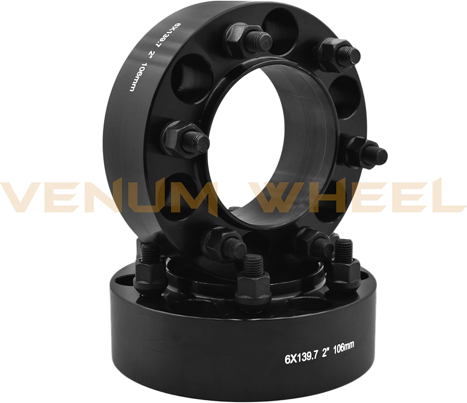 [ PRODUCT DESCRIPTION ] These Black Hub Centric Wheel Spacers are precision engineered for 6 Lug trucks allowing to widen your tire track by 2" on each side, improving the look of your vehicle and accommodating for wider custom wheels. Venum Wheel Accessory products are developed and rigorously tested by ASE certified specialists, in conjunction with many local offroad shops. Aerospace 6061 T-6 aluminum is widely known for strength and light weight, this premium material is guaranteed to withstand even the most extreme environments. We use 10.9 pressed in studs. Once our spacers are properly installed, they stay installed without the risk of vibrations or imbalance. This kit includes all necessary hardware for installation. FREE THREAD LOCKER INCLUDED [ COMPATIBLE WITH ] 1996-2018 4Runner 2001-2018 Tacoma 2000-2006 Tundra 2000-2006 Sequoia 2003-2018 GX470/GX460 2011-2014 HL450 1996-1997 LX450 [ IMPORTANT NOTES ] Professional installation recommended -We recommend getting these adapters installed by a trained professional, but it is not necessary. Make sure you get 5-7 turns before tightening -Must be torqued down to FACTORY SPECS. Vehicles studs cannot pass the face of the adapter -If the studs do pass the face of the adapter, you will need to grind/cut them shorter. Only applies to 1.5" or smaller adapters. 310 763 0028