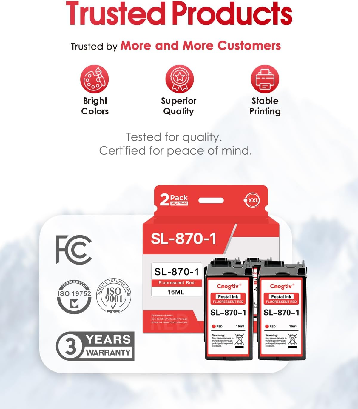 What you will get: 2 x SL-870-1 XXL Red Ink Cartridges Compatible Printers: New SendPro Mailstation Postage Printer Ink Meter (CSD1) Machine High-end quality, excellent printing Firm fixing: Smooth toner flow, strong adhesion, and long-lasting black output without fading, even after repeated handling. GoodSL-870-1 XXL Red Ink Cartridge should be like this: High Page Yield –Our SL-870-1 XXL Red Ink Cartridge is designed for high-volume printing, offering up to 1000-1600 impressions per red ink cartridge. Perfect for both home offices and small businesses, this value pack helps you save on printing costs without compromising on quality. Wide Application Range – Designed for various high-demand environments such as corporate offices, schools, universities, and government agencies. Perfect for printing reports, contracts, training manuals, and marketing materials with speed and reliability. Exceptional Print Quality – Delivers sharp, clear text and rich, deep blacks for a professional finish on every page. Ideal for documents, presentations, and any high-visibility print materials. Better Printing Experience – Produced with high-quality materials and advanced manufacturing technology to ensure consistent performance from the first page to the last. We are committed to delivering you a smooth, reliable, and enjoyable printing experience!